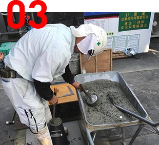 納入されてくる生コンが規定通り配合等されているかどうかその場で試験を行います。
